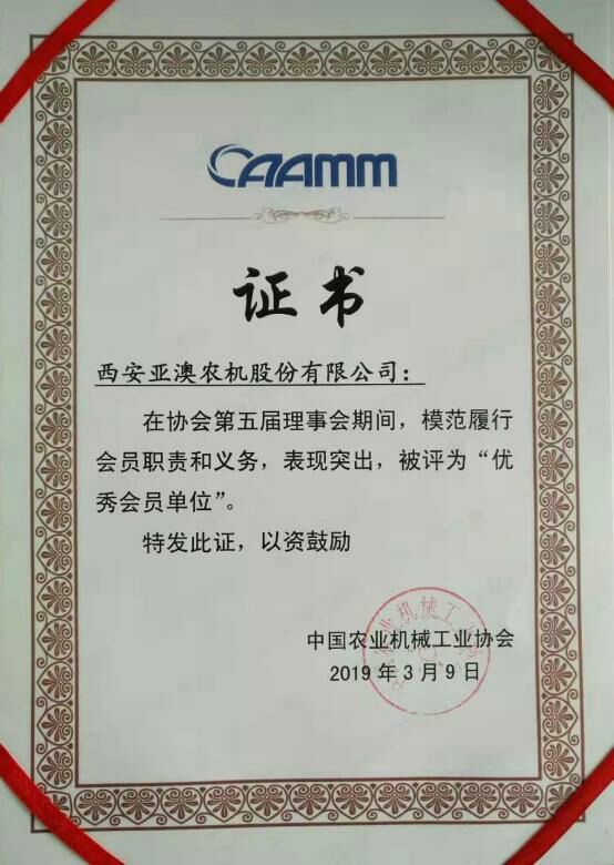 大會宣讀了中國機械工業(yè)聯(lián)合會《關(guān)于中國農(nóng)業(yè)機械工業(yè)協(xié)會理事會換屆的批復(fù)》。審議通過了陳志會長代表協(xié)會第五屆理事會作的《中國農(nóng)機工業(yè)協(xié)會第五屆理事會工作報告》和侯慶忠執(zhí)行副會長作的《中國農(nóng)機工業(yè)協(xié)會第五屆理事會財務(wù)收支情況報告》,審議通過了《中國農(nóng)業(yè)機械工業(yè)協(xié)會章程》,選舉產(chǎn)生了中國農(nóng)業(yè)機械工業(yè)協(xié)會第六屆理事會和第一屆監(jiān)事會。 為表彰協(xié)會五屆理事會履職以來,為推進農(nóng)機工業(yè)技術(shù)進步和健康發(fā)展做出積極貢獻的優(yōu)秀集體和個人,會議還授予侯慶忠等10人為“優(yōu)秀協(xié)會工作者”,授予企業(yè)管理委員會等5個分支機構(gòu)為“先進分支機構(gòu)”,授予西安亞澳農(nóng)機股份有限公司等33家單位為“優(yōu)秀會員單位”。 亞澳農(nóng)機總經(jīng)理史森強應(yīng)邀參會并參加相關(guān)活動。榮獲“優(yōu)秀會員單位”是協(xié)會對亞澳多年來投身農(nóng)機事業(yè)的充分肯定和高度認(rèn)可,亞澳也將以此為契機,不忘初心、篤定前行,為促進我國農(nóng)機產(chǎn)業(yè)轉(zhuǎn)型升級,推動我國農(nóng)業(yè)全程全面機械化做出新的更大貢獻。