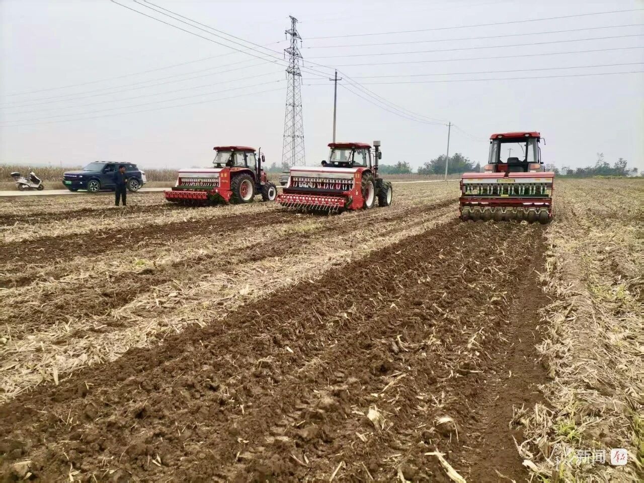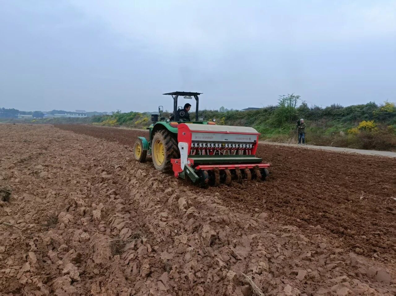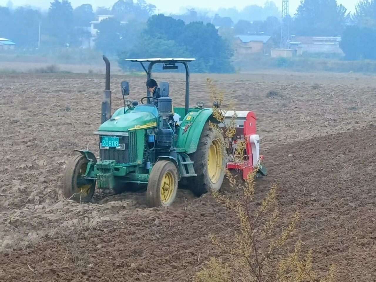 在百公里外的銅川市耀州區(qū)小丘鎮(zhèn)中原村,亞澳農(nóng)機同樣成為搶種主力。“播種期推遲了近十天,土壤又濕,最怕播深不均和倒伏。”農(nóng)機手操控著亞澳寬幅溝播機穿梭田間,機具搭載的指夾式排種器實現(xiàn)精準下種,配合可調(diào)節(jié)播深系統(tǒng),將播種深度嚴格控制在2—4cm的最佳范圍,既滿足銅川市農(nóng)機推廣站副站長姚關盈提出的“淺播搶積溫”要求,又通過均勻播種避免了“播量過大易倒伏”的風險。截至目前,銅川市已調(diào)度1600余臺套農(nóng)機投入秋播,亞澳機具憑借“旋耕、播種、施肥一體化”優(yōu)勢,大幅提升了濕墑地塊的作業(yè)效率,助力農(nóng)戶把延誤的農(nóng)時搶回來。