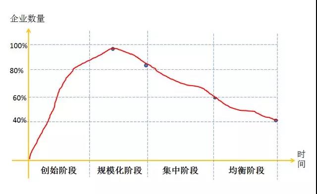 在一個(gè)行業(yè),從長期看,企業(yè)要存活下來就要有超出平均水平的成本控制能力。管理學(xué)家陳春花認(rèn)為一個(gè)行業(yè)內(nèi)企業(yè)數(shù)量和時(shí)間軸之間的關(guān)系可以通過四個(gè)發(fā)展階段來說明:初創(chuàng)階段、規(guī)?;A段企業(yè)數(shù)量一直上升,規(guī)模化后期企業(yè)數(shù)量達(dá)到頂峰,開始有擠出效應(yīng),約20%企業(yè)出局,到集中階段又有20%企業(yè)出局,到均衡階段還要淘汰20%,最后的競爭就在剩下的40%企業(yè)之間展開。