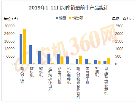 2019年1-11月,上榜河南用戶(hù)購(gòu)機(jī)量前十的農(nóng)機(jī)產(chǎn)品如下圖所示,輪式拖拉機(jī)、旋耕機(jī)、微耕機(jī)等10種農(nóng)機(jī)合計(jì)購(gòu)買(mǎi)力接近8.5萬(wàn)臺(tái),占了河南農(nóng)機(jī)總銷(xiāo)量的約80%,對(duì)這10類(lèi)農(nóng)機(jī)的購(gòu)機(jī)支出達(dá)43.3億元。