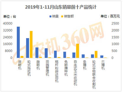 2019年1-11月,上榜山東用戶(hù)購(gòu)機(jī)量前十的農(nóng)機(jī)產(chǎn)品如下圖所示,微耕機(jī)、輪式拖拉機(jī)、旋耕機(jī)等10種農(nóng)機(jī)合計(jì)購(gòu)買(mǎi)力11.5萬(wàn)多臺(tái),是山東農(nóng)機(jī)總銷(xiāo)量的86.54%,對(duì)這10類(lèi)農(nóng)機(jī)的購(gòu)機(jī)支出達(dá)38.55億元。