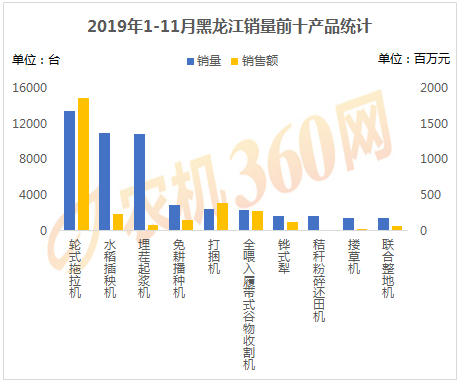 2019年1-11月,上榜黑龍江用戶(hù)購(gòu)機(jī)量前十的農(nóng)機(jī)產(chǎn)品如下圖所示,輪式拖拉機(jī)、水稻插秧機(jī)、埋茬起漿機(jī)等10種農(nóng)機(jī)合計(jì)購(gòu)買(mǎi)力4.9萬(wàn)臺(tái),是黑龍江農(nóng)機(jī)銷(xiāo)量的93.09%,對(duì)這10類(lèi)農(nóng)機(jī)的購(gòu)機(jī)支出達(dá)32.23億元。
